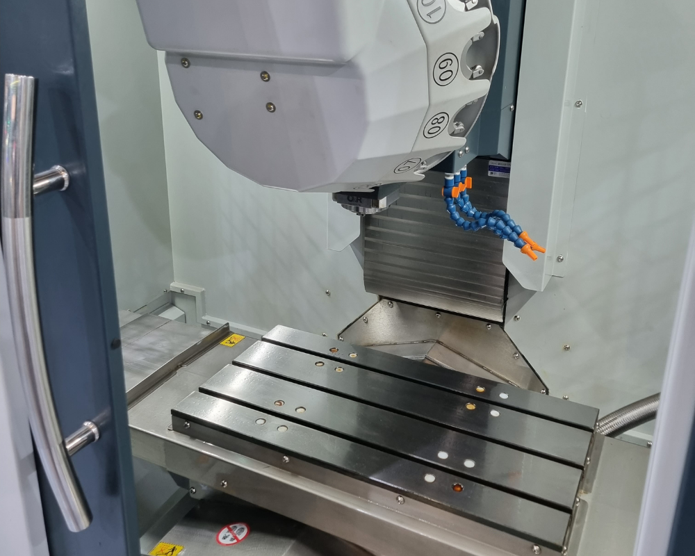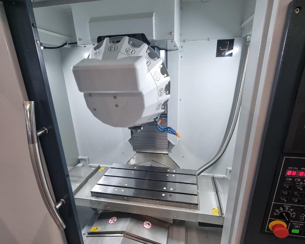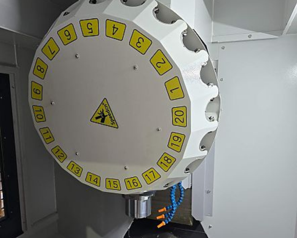 A máquina opera através de três eixos coordenados (X, Y, Z) com guias lineares de alta precisão, permitindo posicionamentos exatos e movimentos suaves durante todo o ciclo de usinagem. O sistema de magazine de ferramentas com capacidade para 20 posições e fixação pneumática garante trocas rápidas e seguras, enquanto o motor principal de alta rotação (até 12.000 rpm) proporciona acabamentos superiores e maior produtividade, especialmente em materiais como alumínio e ligas leves.
