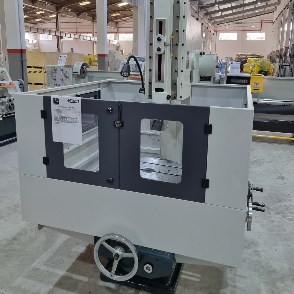 O princípio de funcionamento baseia-se na ação de um cabeçote com movimento de vai-e-vem que executa cortes progressivos no material, permitindo a abertura de rasgos com dimensões exatas e acabamento superior. A mesa giratória possibilita o posicionamento preciso da peça, enquanto os comandos de avanço garantem controle total sobre a profundidade e largura do rasgo. Com capacidade para trabalhar materiais como aço, alumínio, bronze, latão, ligas e ferro fundido, a chaveteira vertical atende às mais rigorosas especificações técnicas da indústria metalmecânica.